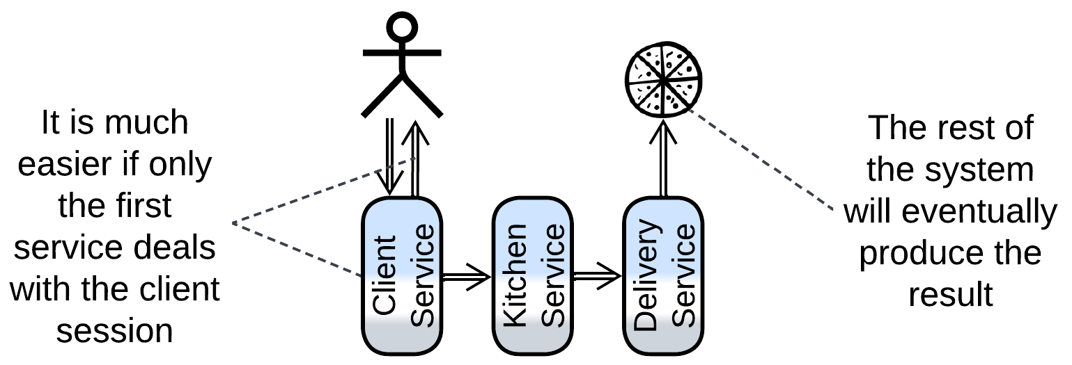 It is possible to avoid both adding a Gateway and having the cyclic dependency if clients don’t immediately need the final results of processing their requests. In such a case the service which receives the original request does its (first) step of processing, sends the response to the client, and then notifies services down the pipeline. Though such a use case seems to be unlikely, it happens in real life, for example, with pizza delivery. As soon as a buyer fills in their contact details and pays for the food, the order can be confirmed and forwarded to the kitchen. When it is ready it’s forwarded to the delivery, and finally the physical goods appear at the buyer’s door.
