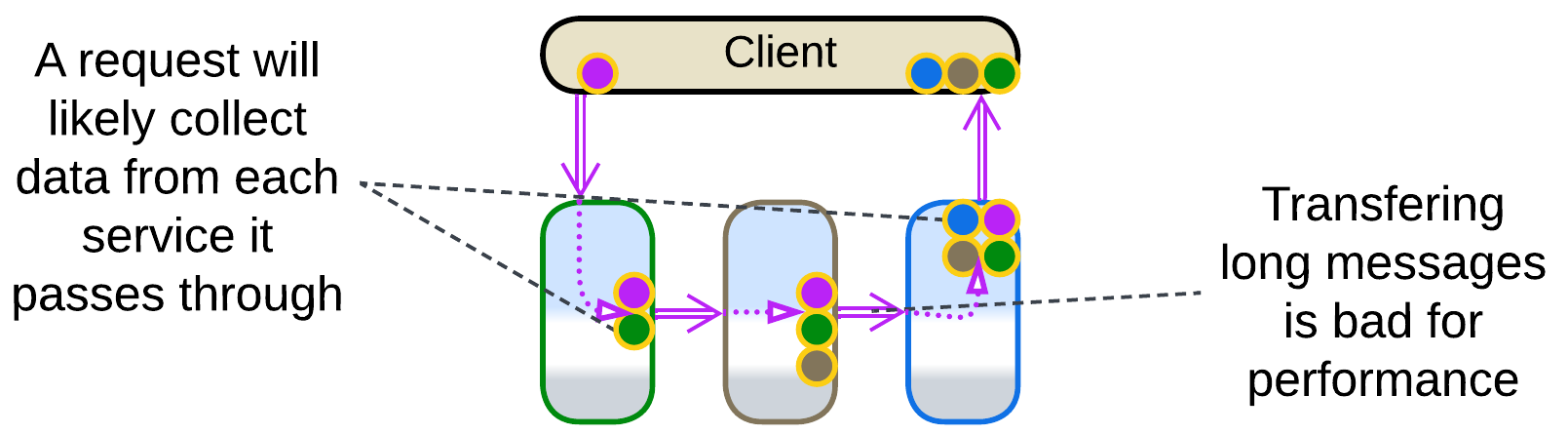 On the bright side, there is no communication overhead caused by response messages as there are no responses – the processing cost is one message per service, half of the cost for an orchestrated architecture. Still, messages in choreographed systems tend to be longer than those used with orchestration as each message needs to carry the entire request’s state – there is no Orchestrator to own the state and distribute parts of the payload among involved services.