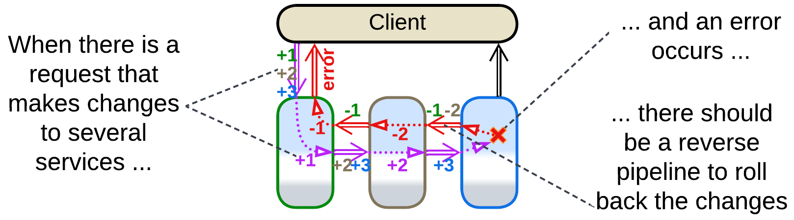 In that case there is no owner for workflows – each request is just a data packet which is transformed multiple times as it passes through the Pipeline. Debugging is mostly limited to reading logs as there is no dedicated component to connect to for single-step execution of a use case. Nor is there a single piece of code to define each of the system-wide scenarios – their logic emerges from the graph of event channels that connect services and from messages that each involved event handler sends. Consistency of the services’ states is the responsibility of the services themselves as there is none supervising them.