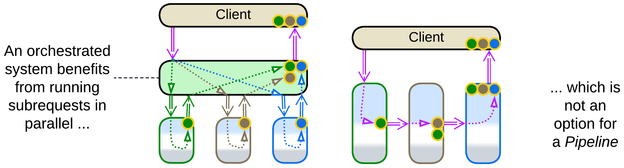 Latency may also be suboptimal as parallelizing execution of a request is easier said than done because there is no place (Aggregator [EIP]) to collect multiple related messages, which also means that there is no associated cost in resources (RAM and CPU time) for storing their fragments. Please note that an Aggregator, when added, starts orchestrating the system – it stands between the client and services and meddles with the traffic and logic. It spends resources to store the received messages for aggregation, and the messages start forming request/confirm pairs – which are characteristic of orchestration.