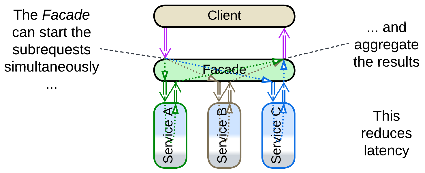 A Facade also supports querying the services in parallel and collecting the data returned into a single message through the Splitter and Aggregator patterns of [EIP]. That reduces latency (and resource consumption as the whole task is completed faster) for scatter or gather requests when compared to sequential execution.
