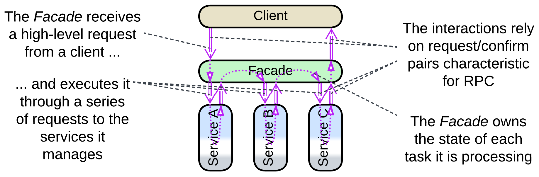 In a backend which serves client requests an Orchestrator takes the role of Facade [GoF] – a module that provides and implements a high-level interface for a multicomponent system. It sends requests to the underlying services and waits for their confirmations – the mode of action that can be wrapped in an RPC (remote procedure call). The state of each scenario that the facade runs resides in the associated thread’s or coroutine’s call stack (for Reactor [POSA2] or Half-Sync/Half-Async [POSA2] implementations, respectively) or in a dedicated object (for Proactor [POSA2]).