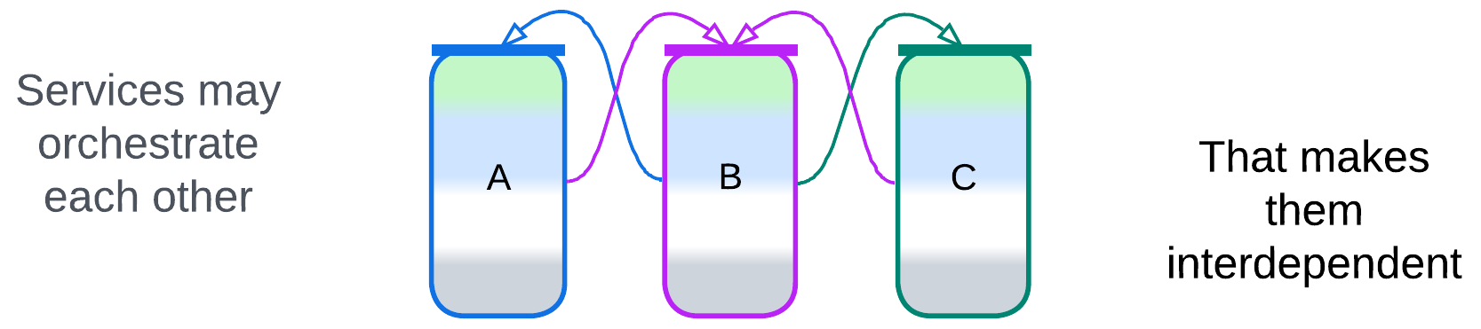 In real life services are likely to be layered, with their upper layers acting as both internal and external Orchestrators. Layering isolates interdependencies to the relatively small application-level components and resolves, to an extent, the seemingly counterintuitive case of mutual orchestration as now there is an explicit, though fragmented, system-wide orchestration layer.