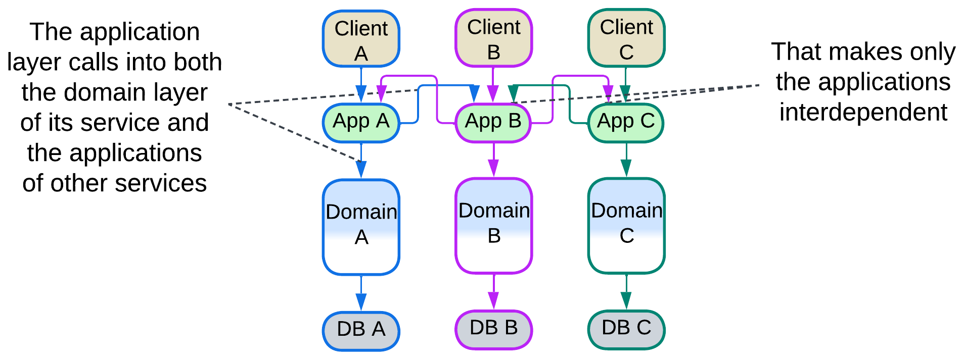 In some systems there are several services that have their own kinds of clients (for example, employees of different departments). Each of the services tries hard to process its clients’ requests on its own but occasionally still needs help from other parts of the system. This creates a paradoxical case where several services orchestrate each other: