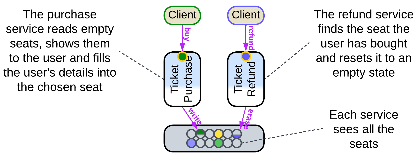 The most common case of shared data is storage (usually a database, sometimes a file system) for a (sub)domain that has functionally independent services which operate on a common dataset. For example, a ticket purchase service and a ticket refund service share a database of ticket details. The ticket purchase service reads in the available seats and fills in ticket data for purchases. The ticket refund service should be able to find all tickets bought by a user and delete the user data from seats refunded. The only communication between the purchase and refund services is the shared database of tickets or seats, so that one of them sees the changes made by the other the next time it reads the data.