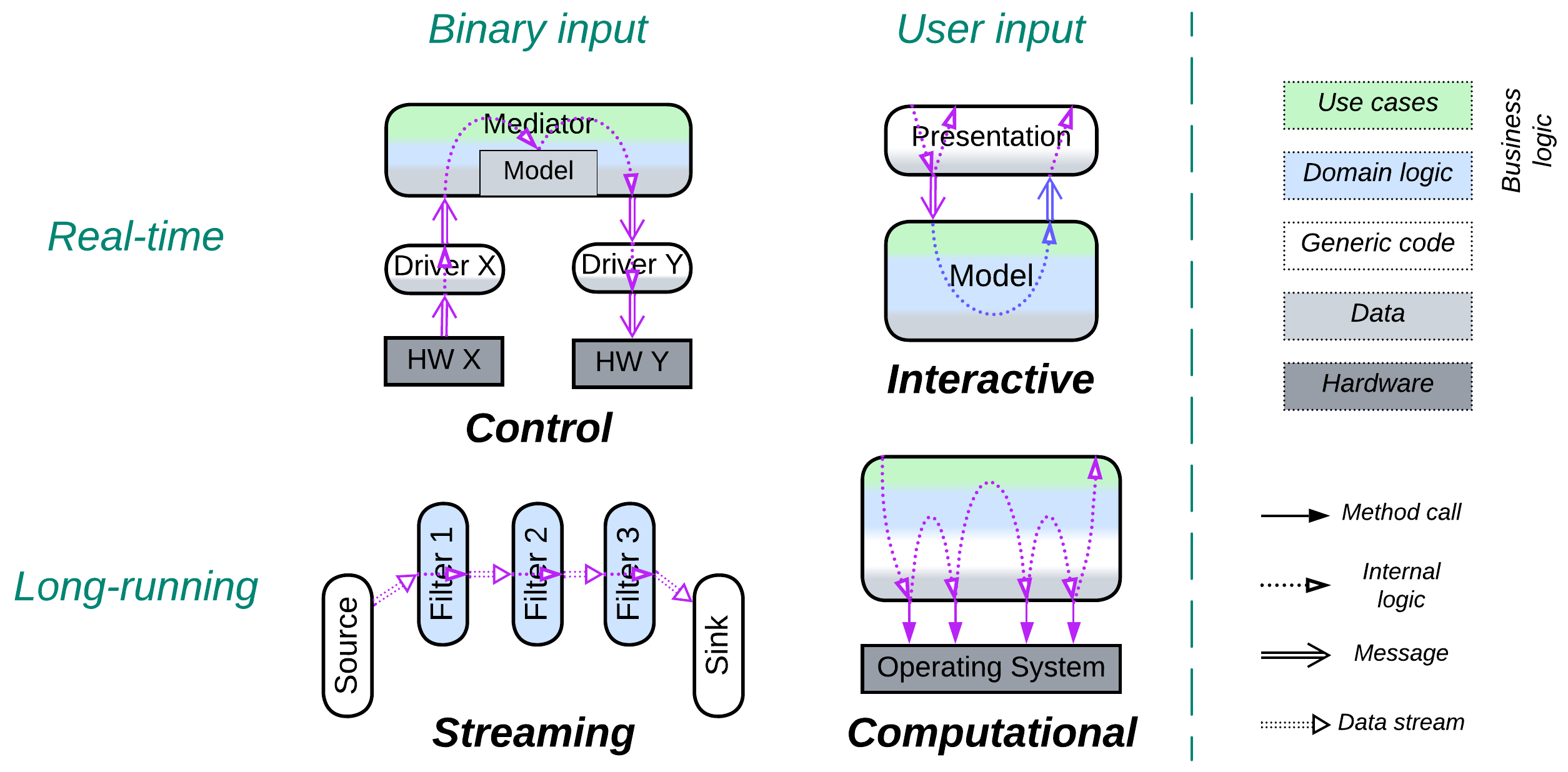 Long-running programs with user input are probably the most common, ancient, and well-studied kind of software, which also inspired many design patterns. Those of special significance are: