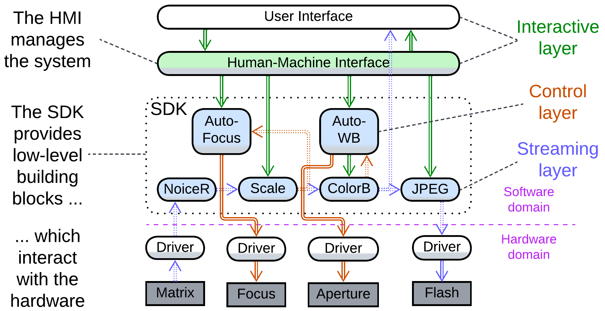 - An image processing pipeline applies noise reduction, rescaling, and color correction, then either passes the resulting frames to the UI to show them on the screen or proceeds with compressing the frame and storing it as a file.