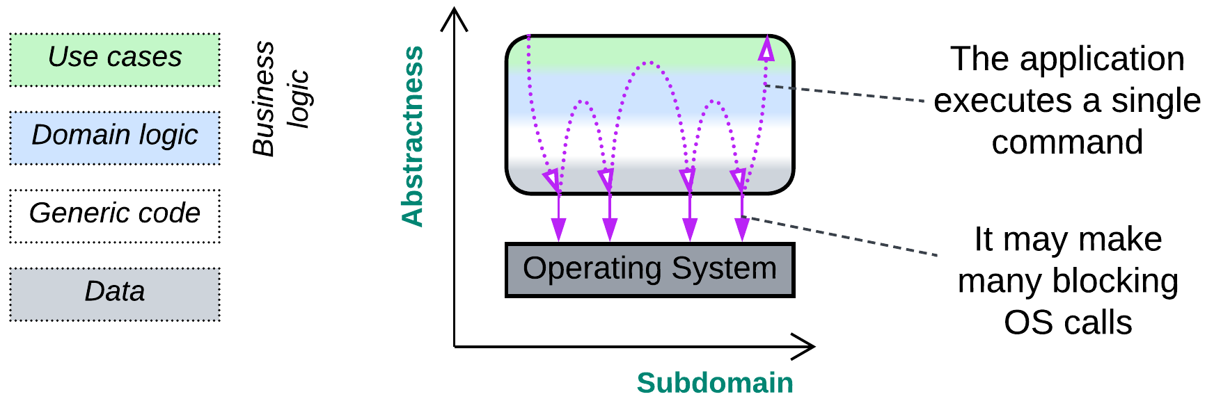 - The presentation layer may wait for the business logic to execute the user’s action, blocking further user input and screen updates (air conditioner controller), or it may asynchronously pass the command to the lower layer and continue processing new user input and showing progress of the already running tasks (many games) while the main program is busy with the command.