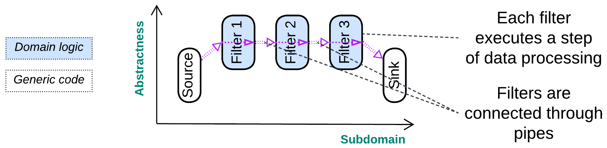 Pipes and Filters [POSA1, POSA4] is the stream processing pattern that describes pipelines: the system is built of filters (individual data processing steps) connected through pipes (data channels).