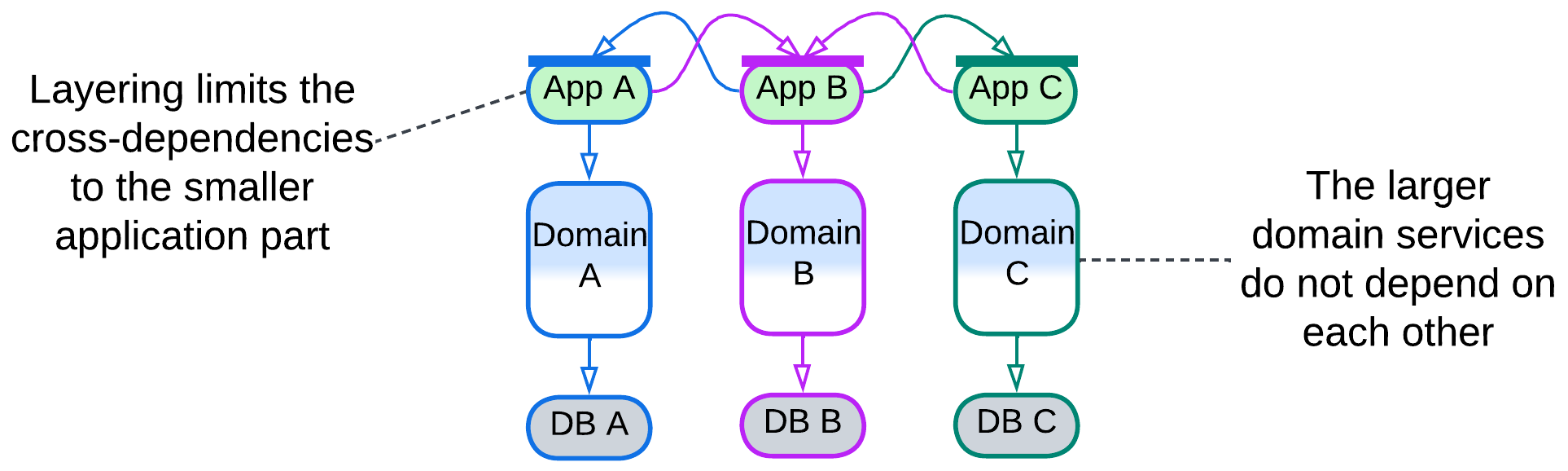 - Independent scaling of layers of the services. It is common to have multiple instances (with the number varying from service to service and changing dynamically under load) of the layers that contain business logic while the corresponding data layers (databases) are limited to a single instance.