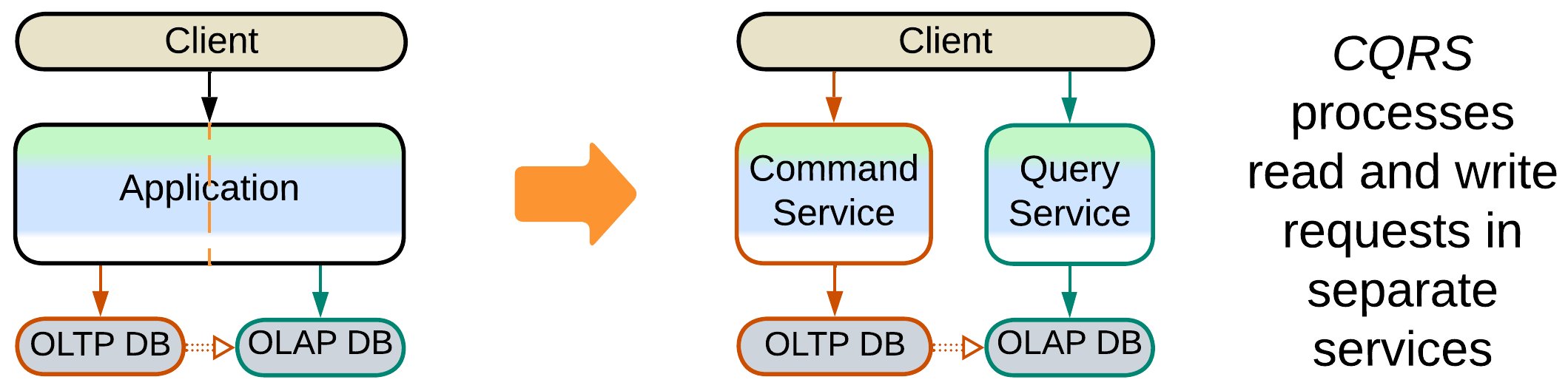 - The service that uses the read and write databases is split into separate read and write services.