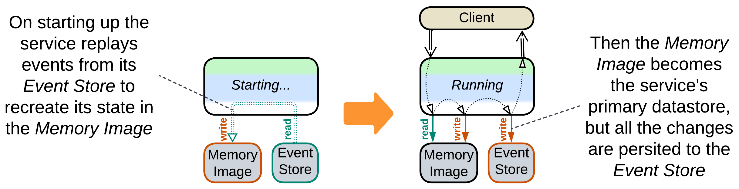 Event sourcing (of Event-Driven Architecture or Microservices) is all about changes. A service persists only changes to its data instead of the current data. As a result, the service needs to aggregate its history into a Memory Image (Materialized View [DDIA]) by loading a snapshot and replaying any further events to rebuild its current state (which other architectural styles store in databases) and start operating.