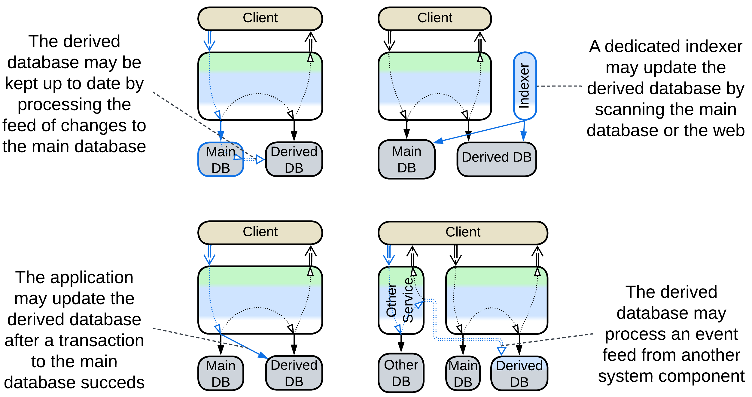 - Variants with derived databases have an aspect of Pipeline and are closely related to CQRS.