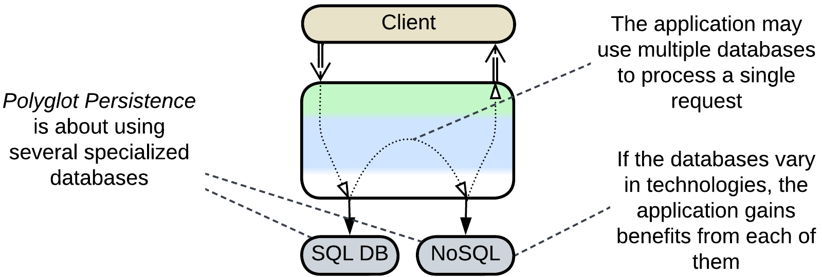 Polyglot Persistence employs several specialized databases to improve performance, often at the cost of eventual data consistency or implementing transactions in the application.