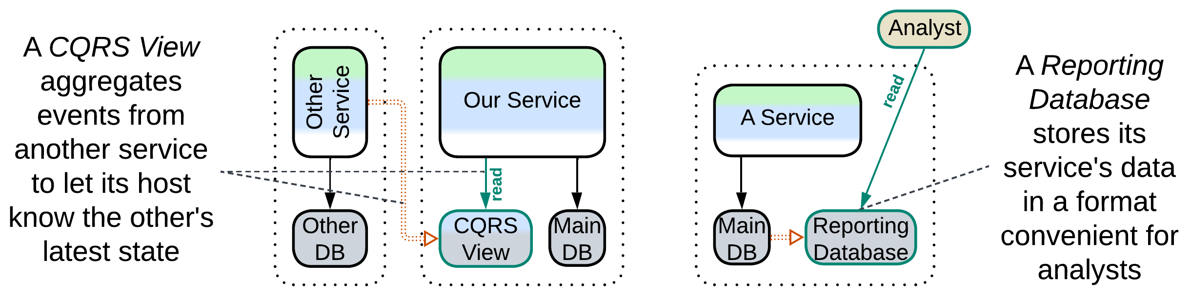 A Reporting Database (or Source-Aligned (Native) Data Product Quantum of Data Mesh [SAHP]) derives its data from a write-enabled database in the same subsystem (service) while a CQRS View [MP] or Event-Sourced View [DEDS] is fed a stream of events from another service from which it filters the data relevant to its owner. This way a CQRS View lets its owner service query (its replica of) the data that originally belonged to other services.