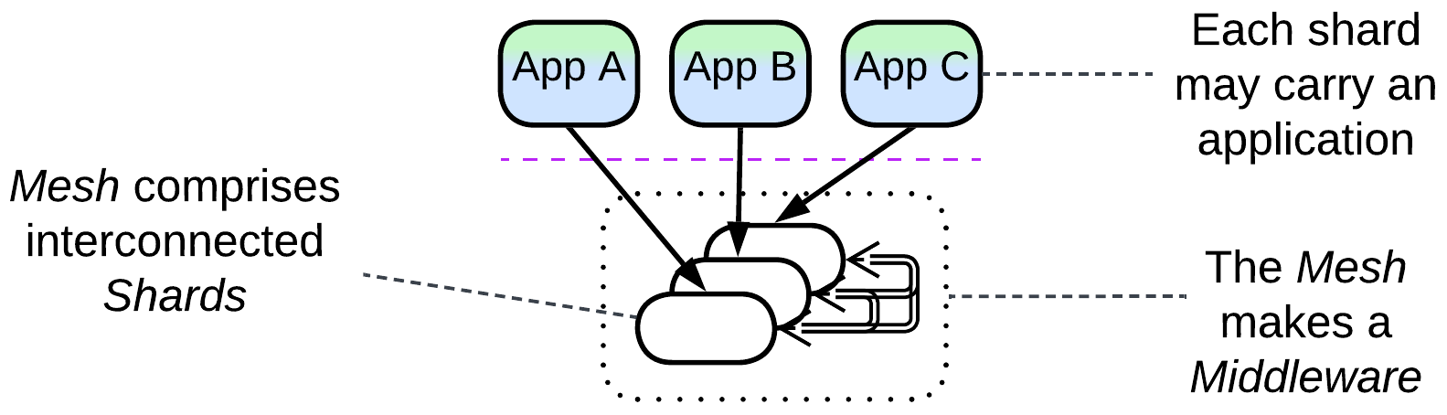 A Mesh consists of intercommunicating shards, each of which may host an application. The shards coalesce into a fault-tolerant distributed Middleware.