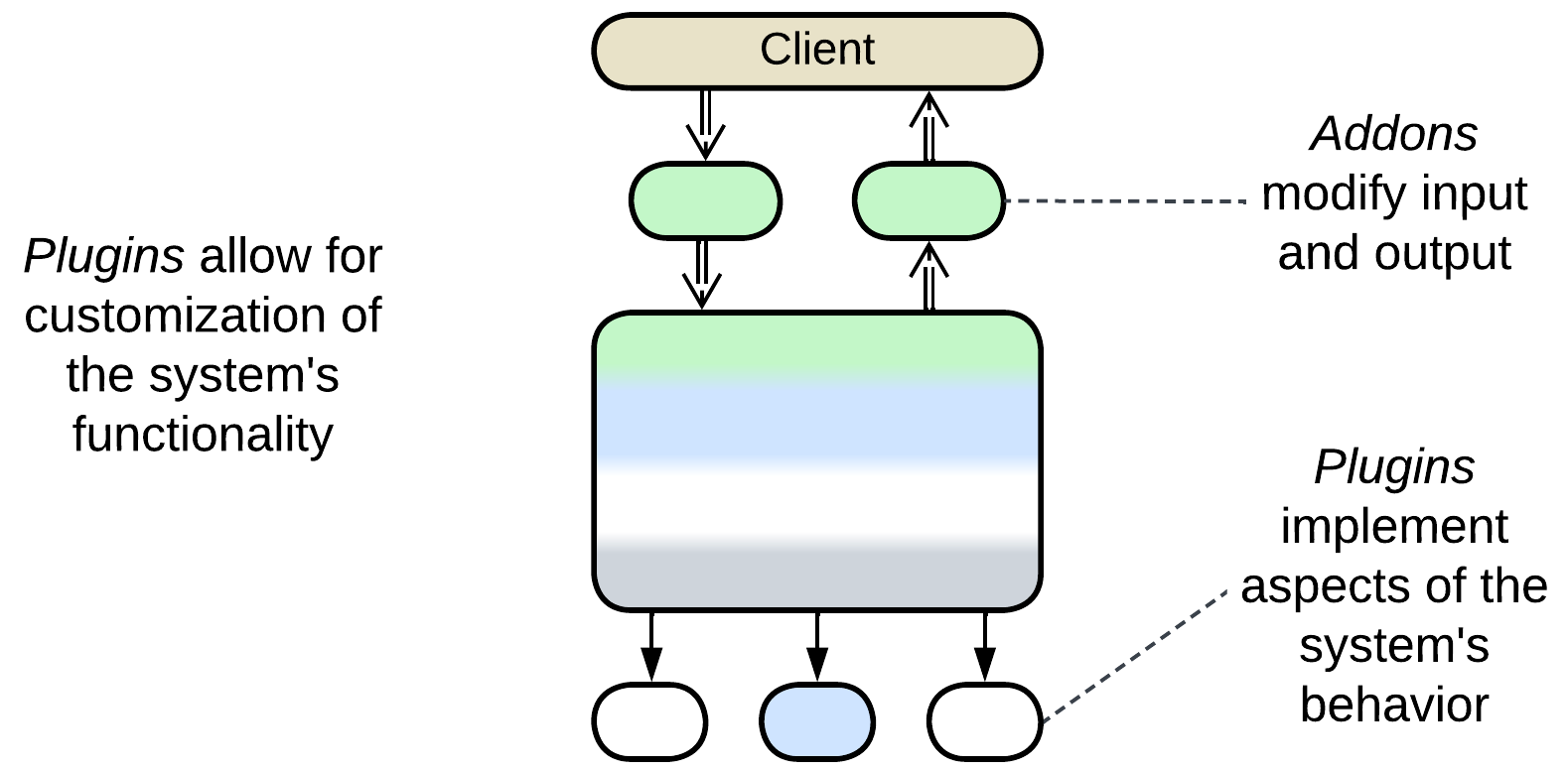 Microkernel is another derivation of Plugins, with a rudimentary core component which mediates between resource consumers (applications) and resource providers. The microkernel is a Middleware to the applications and an Orchestrator to the providers.
