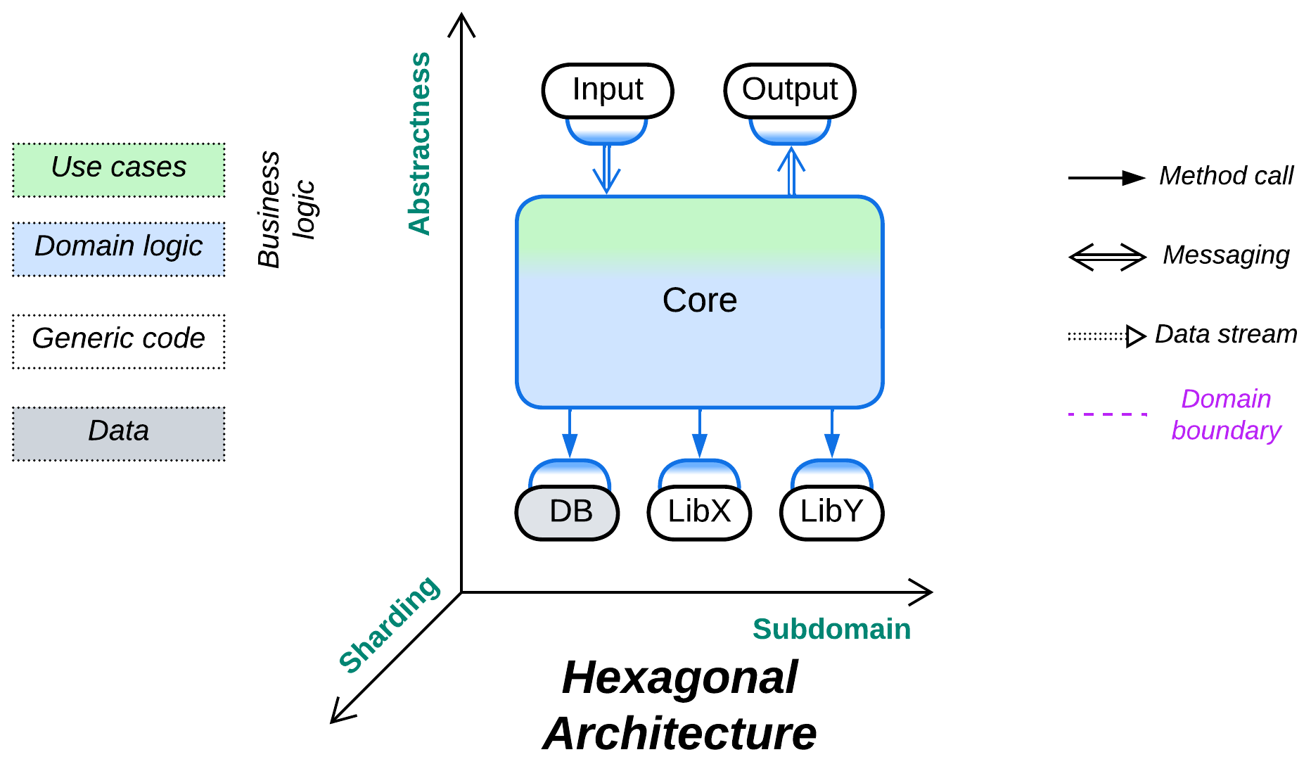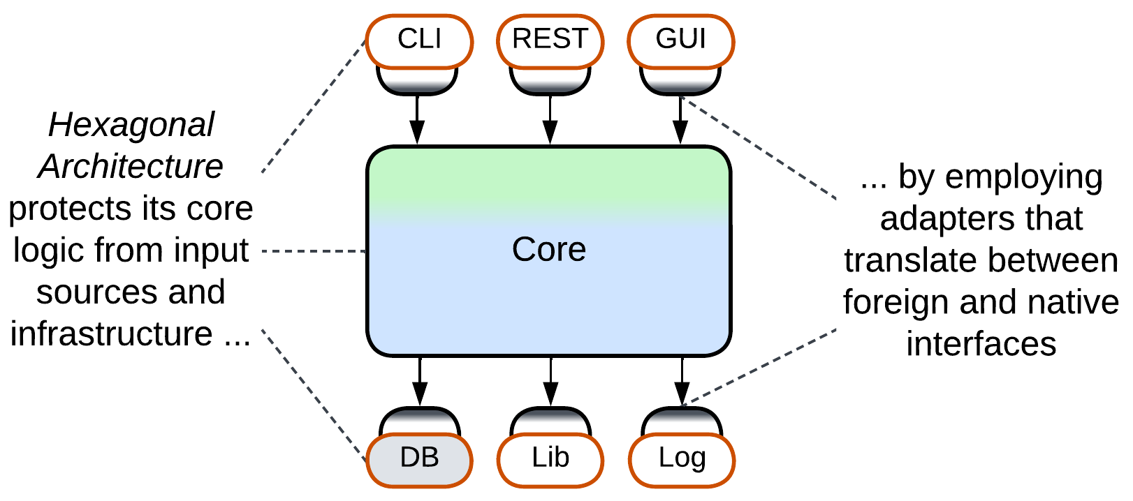 - Medium-sized or larger components. The programmers don’t need to learn details of external technologies and may concentrate on the business logic instead. The code of the core becomes smaller as all the details of managing external components are moved into their adapters.