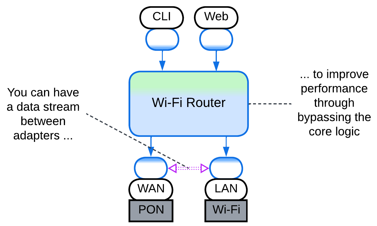 - Low latency. The adapters slow down communication. This is somewhat alleviated by creating direct communication channels between the adapters to bypass the core.
