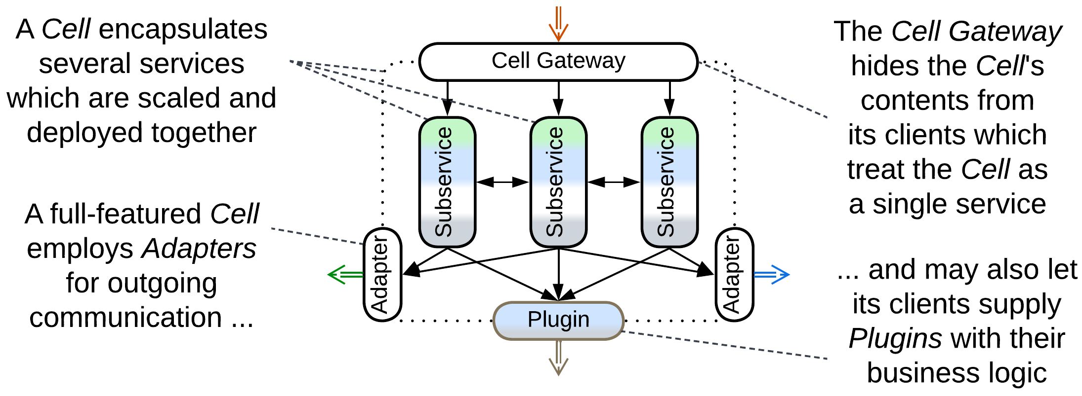 In the simplest implementation a Cell’s contents are hidden from the Cell’s clients by a Cell Gateway which acts as an Open Host Service, allowing for anything inside the Cell to be changed at will with no effect on the outside world.