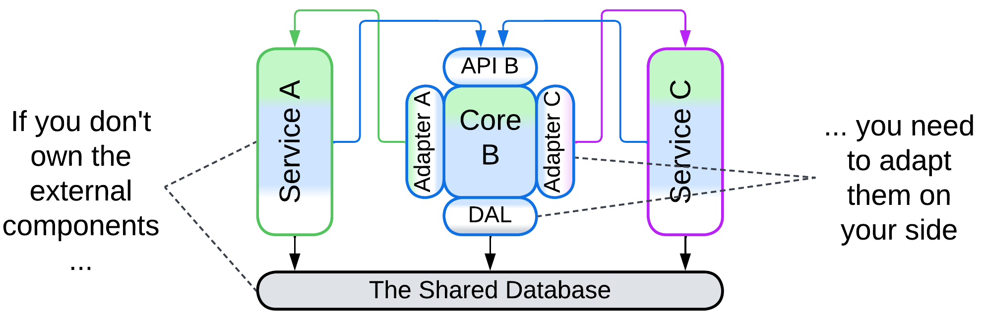 Sometimes you need to adapt an external service which you don’t control. In that case the only real option is to place its adapter together with your core logic. In theory, the adapter can be deployed as a separate component, maybe in a Sidecar [DDS], but that may slow down communication.