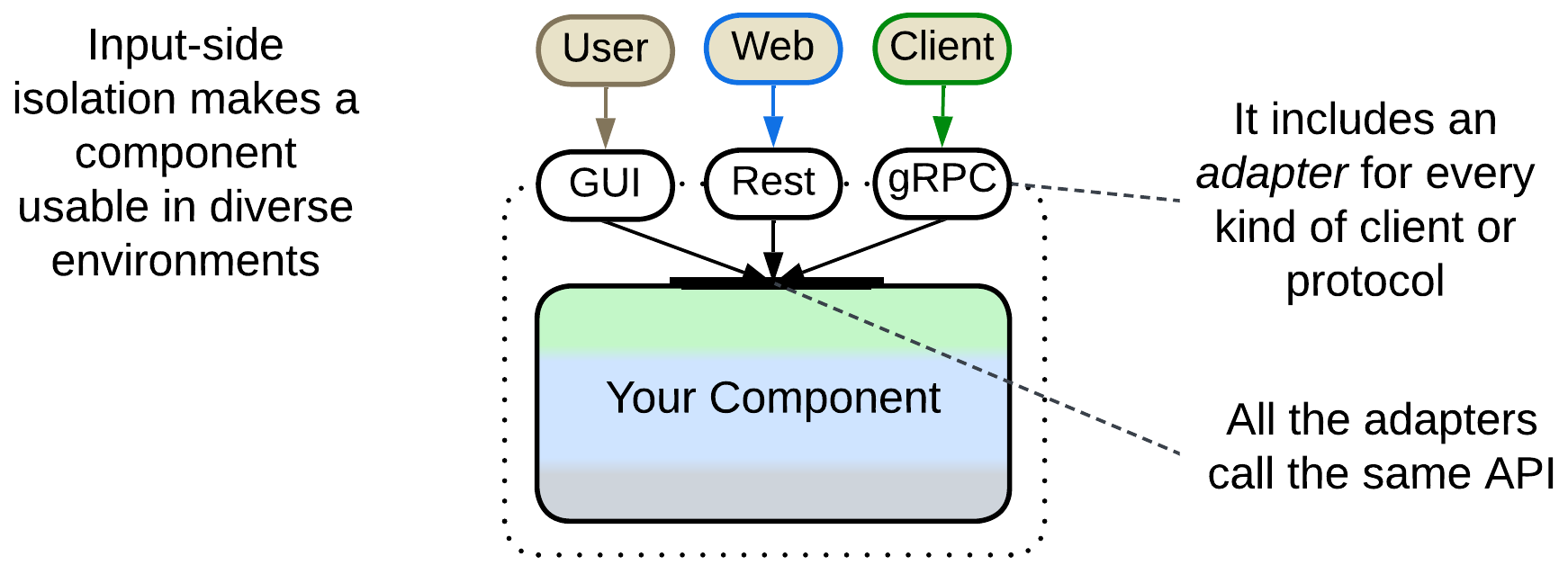 Isolation on the input (primary, driving) side is achieved by designing an Application Programming Interface (API) that provides access to your component’s use cases which your software exists to implement and writing adapters that translate your API into something convenient for every kind of communication used by your clients. For example, you may need a desktop GUI, mobile GUI, CLI, web application (REST), and customer (JSON or gRPC) adapters all of which are built on top of your component’s API.