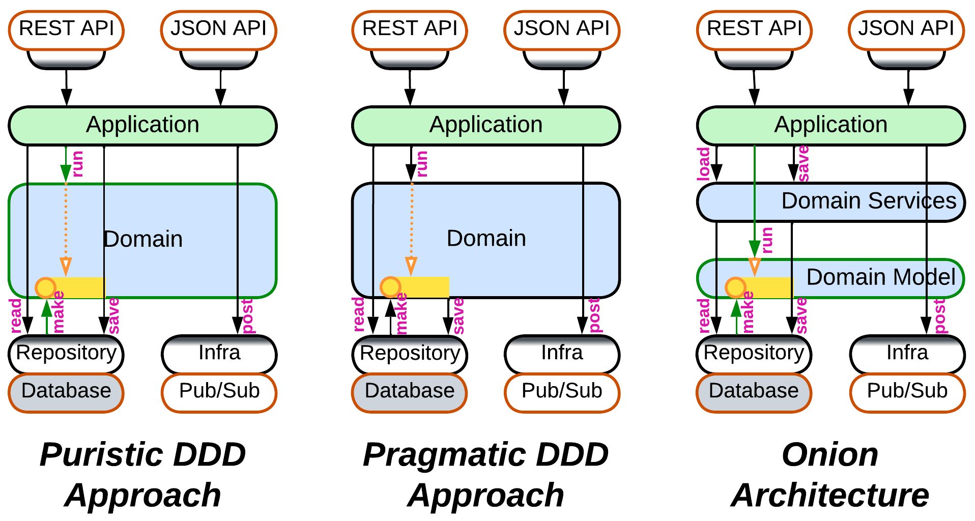 - There is also Clean Architecture which seems to generalize the approaches above without delving into practical details – thus the way it saves its aggregates remains a mystery.