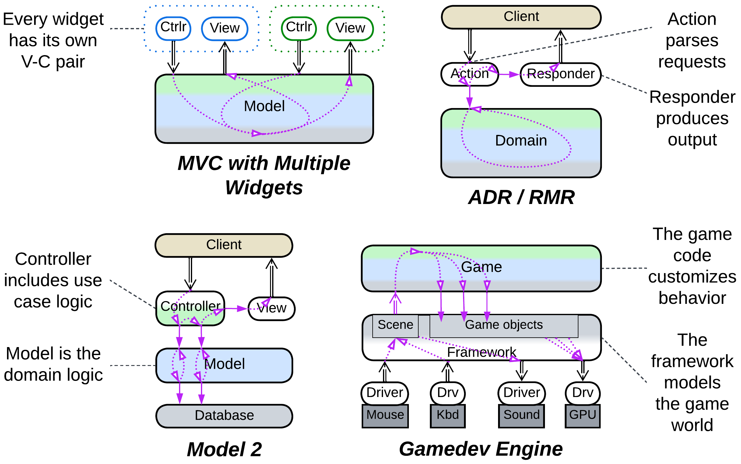 Model-View-Controller (MVC), Action-Domain-Responder (ADR), Resource-Method-Representation (RMR), Model 2 (MVC2), Game Development Engine#