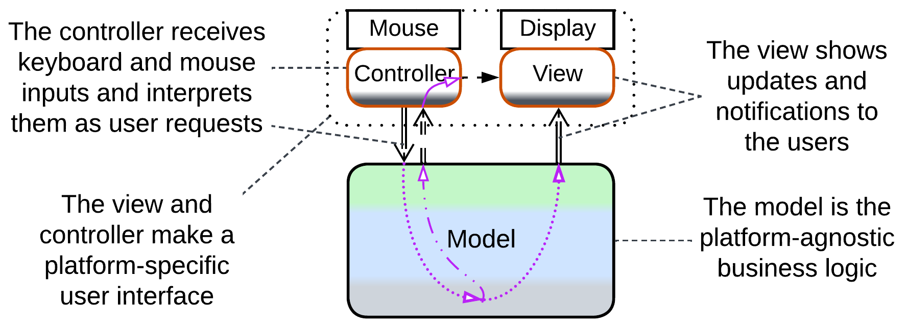 - The model is the main UI-agnostic application which executes controller’s requests and notifies the view and, optionally, controller when its data changes.