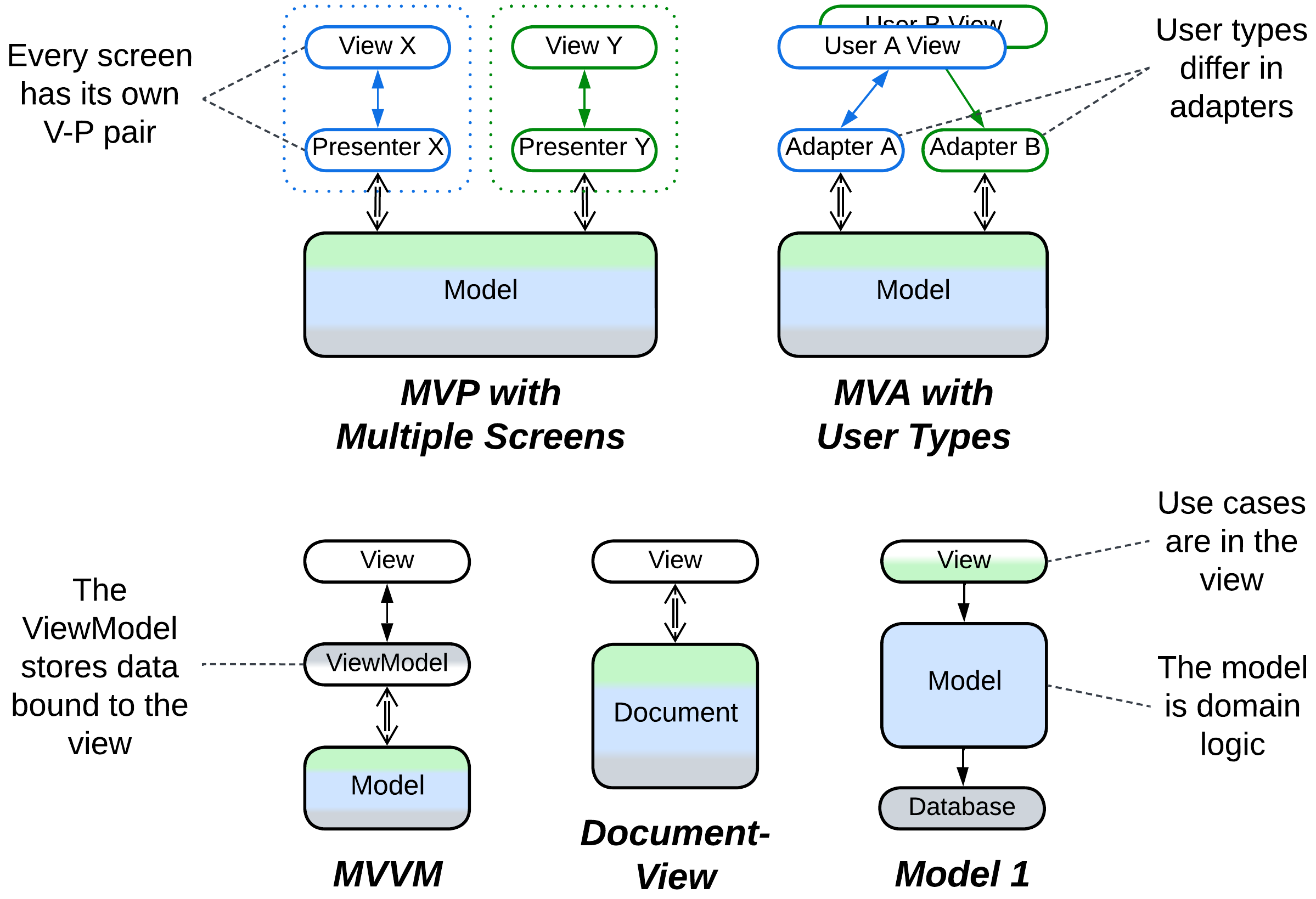 Model-View-Presenter (MVP), Model-View-Adapter (MVA), Model-View-ViewModel (MVVM), Model 1 (MVC1), Document-View#