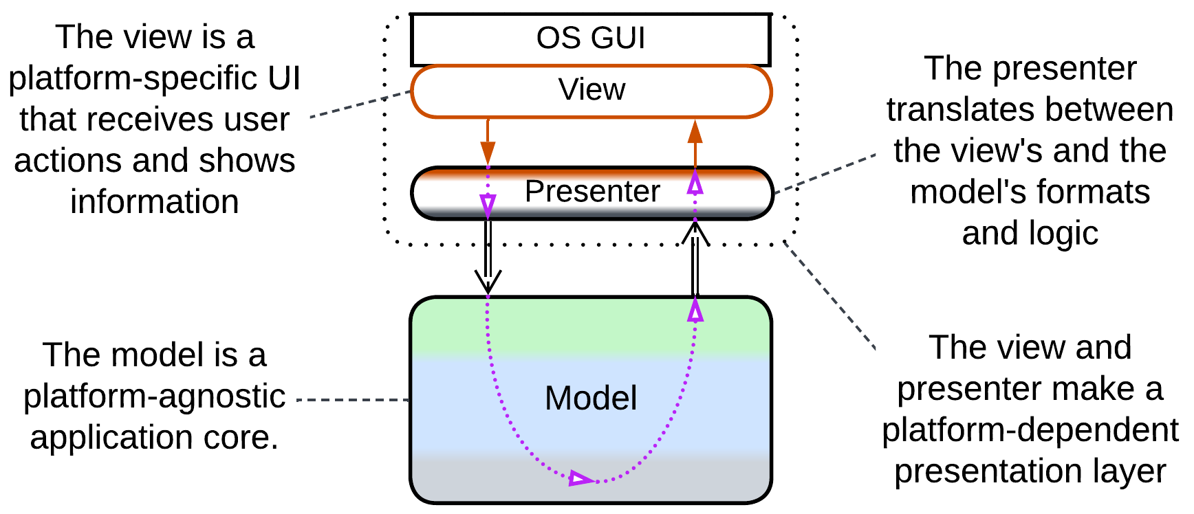 - View – the interface exposed to users. In Hexagonal Architecture’s terms it is an adapter for the OS GUI framework.